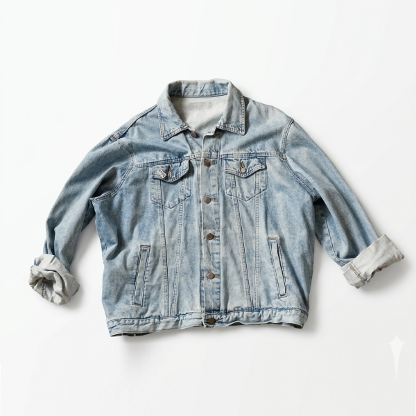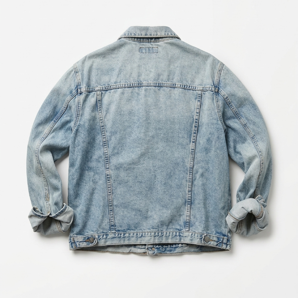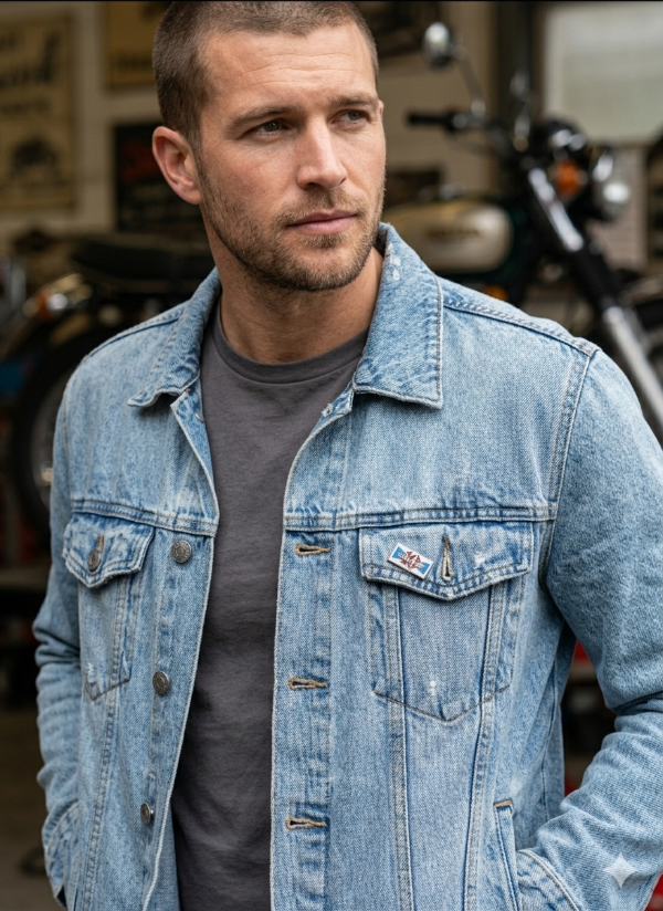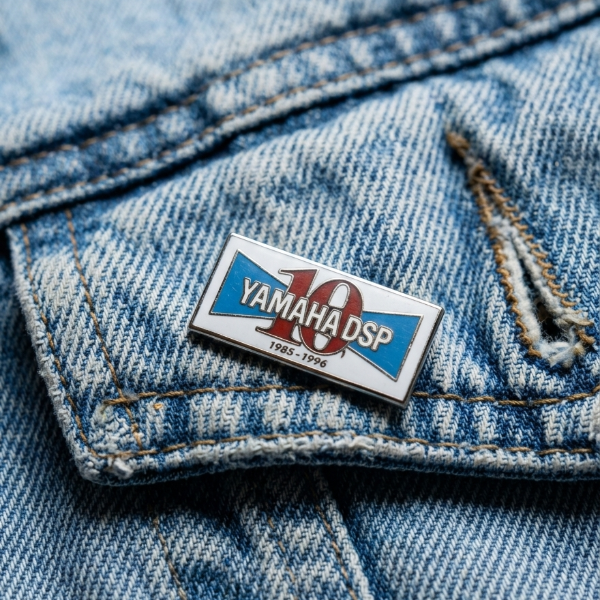 Campera denim azul lavado claro, estilo clásico trucker de los 90s. Pin metálico Yamaha DSP 10 (1985-1996) en el bolsillo.