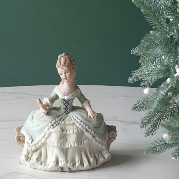 Figura femenina sentada de porcelana pintada a mano, con vestido con miriñaque estilo rococó, corset y abanico. Pieza vintage de inspiración europea, producida para exportación asiática durante la posguerra.